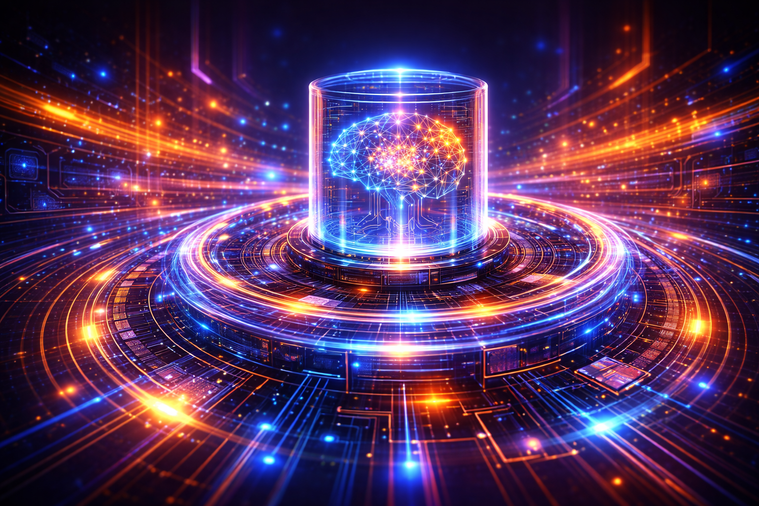 Create a high-quality, cinematic photorealistic visualization of an advanced AI core floating in a dark futuristic tech environment, featuring a glowing central sphere or crystalline core surrounded by multiple spinning gyroscopic rings with circuitry, microchip patterns, thin neon pathways, and data pulses traveling along the lines; include dynamic motion blur on the rotating rings, layered circuit boards and metallic components integrated around the core, with a precise, high-end sci-fi engineering aesthetic; use a cold neon palette of cyan, blue, and violet with strong contrast, soft volumetric haze, reflective metal and glass-like materials, perfectly centered composition, deep layered depth, crisp edges, and clean geometry — no cartoon style, no random text, no distortion, producing a single cinematic image of advanced AI technology.